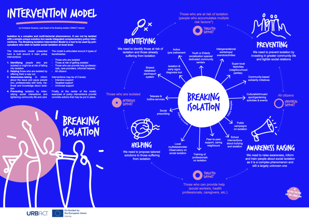 Isolation is a complex and multi-factorial phenomenon that cannot be tackled with a simple unique solution but needs integrated complementary policy interventions. The Breaking Isolation Intervention Model is a tool to be used by policymakers who wish to tackle social isolation at local level. The model is articulated around four main policy interventions: identifying people who are isolated or might be at risk of falling into isolation, helping those who are isolated by offering them a way out, awareness-raising to inform about the issue and equip people (including professionals) with tools, methods and knowledge about isolation, and preventing isolation by intensifying social interactions and tightening community life and care. The model addresses four types of beneficiaries: those who are isolated, those at risk of getting isolated, those who can provide help (professionals, care providers, and informal helpers), and all citizens. Interventions may be of three levels—intensive support, targeted support, and universal support. Finally, at the center of the model, examples of policy interventions provide concrete actions that may be put in place.